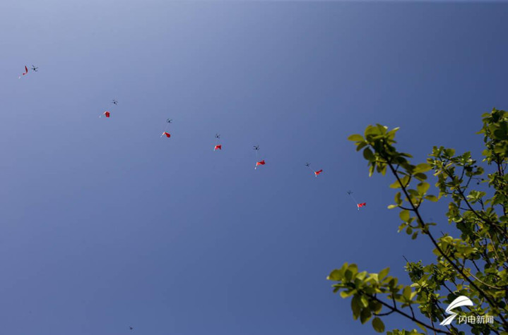 德州市摄影家协会组织精干力量,提前谋划、周密安排,现场运用7架无人机进行队形编组。随着现场指挥人员的口令,无人机依次起飞,悬挂五星红旗,飞越中心广场,引得市民纷纷驻足观看、拍照留念。